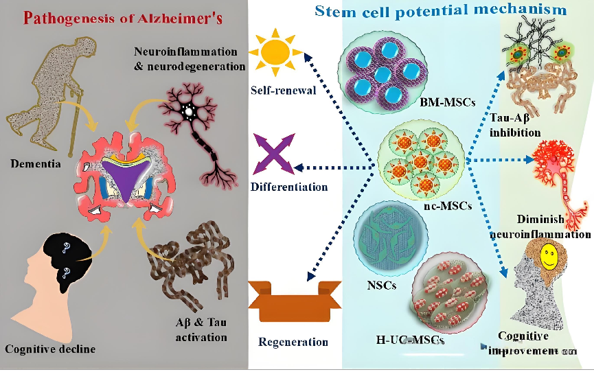 干細胞是一類具有自我更新和多向分化潛能的細胞,就像身體內的“萬能積木”,在特定條件下可分化成各種功能細胞。間充質干細胞(MSCs)、神經干細胞(NSCs)等不同類型干細胞在阿爾茨海默病研究中備受關注。那么,干細胞究竟是如何發揮作用的呢?
