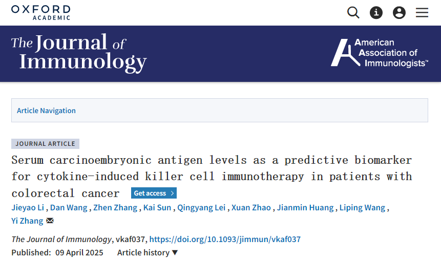 [1]Li, Jieyao et al. “Serum carcinoembryonic antigen levels as a predictive biomarker for cytokine-induced killer cell immunotherapy in patients with colorectal cancer.” Journal of immunology (Baltimore, Md. : 1950), vkaf037. 9 Apr. 2025