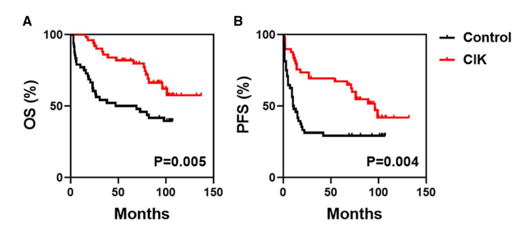 CIK組:50人接受CIK細胞療法聯合手術或化療,每人完成2-8次CIK治療;