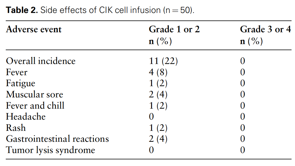 CIK治療未出現嚴重副作用(如器官損傷等),50例患者中僅有11人出現發熱、乏力、肌肉酸痛等輕微不適,且癥狀均可通過簡單治療緩解。