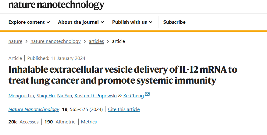 哥倫比亞大學團隊在Nature Nanotechnology 期刊發表了題為:Inhalable extracellular vesicle delivery of IL-12 mRNA to treat lung cancer and promote systemic immunity 的研究論文。