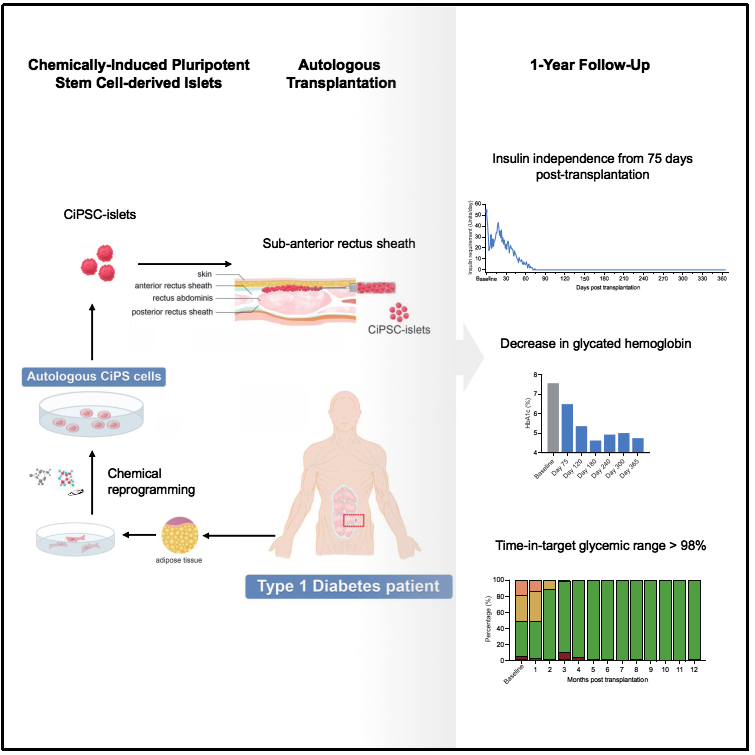 國(guó)際權(quán)威期刊《CELL》刊載了一項(xiàng)由中國(guó)科學(xué)家團(tuán)隊(duì)完成的重大研究:首次通過基于干細(xì)胞的療法,成功實(shí)現(xiàn)1型糖尿病患者的臨床功能性治愈。研究論文題為《Transplantation of Chemically Induced Pluripotent Stem-Cell-Derived Islet Under Abdominal Anterior Rectus Sheath in a Type 1 Diabetes Patient》。