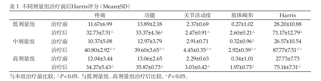 髖關節功能改善:治療6個月后,低、中、高三個劑量組患者的髖關節Harris評分均較治療前顯著提高,差異具有統計學意義。