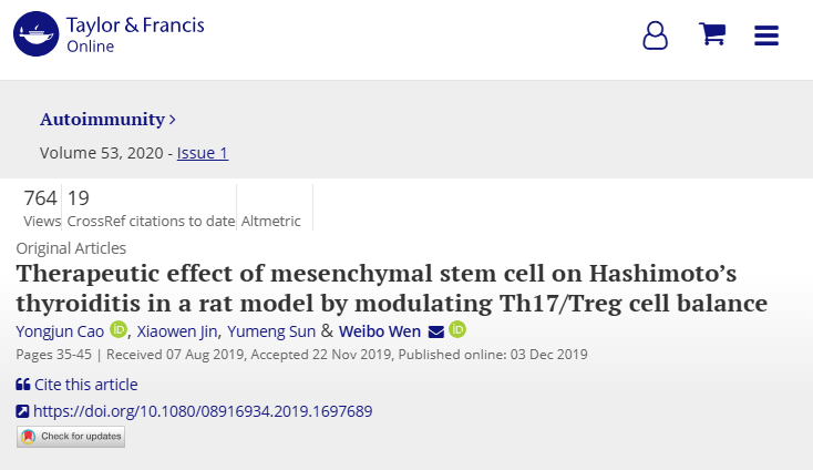 一項發表于《Autoimmunity》的研究《Therapeutic effect of mesenchymal stem cell on Hashimoto's thyroiditis in a rat model by modulating Th17/Treg cell balance(干細胞通過調節Th17/Treg細胞平衡改善大鼠橋本甲狀腺炎的治療效果)》顯示,研究人員利用雌性SD大鼠構建HT模型,評估MSCs對Th17/Treg平衡的調節作用: