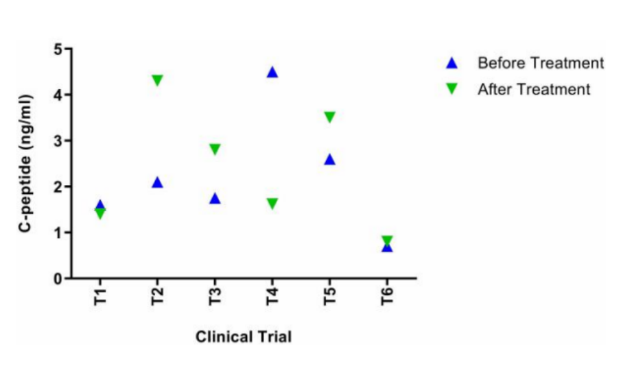 根據(jù)研究試驗(yàn),使用間充質(zhì)干細(xì)胞干預(yù)Ⅱ型糖尿病,胰島素抵抗和胰島素依賴性減少。此外,HbAc1和FBG水平的顯著降低提示肝功能得到改善。這些試驗(yàn)還顯示,在2個(gè)試驗(yàn)(T1和T4)中,c肽水平下降到正常水平,這表明體內(nèi)負(fù)責(zé)胰島素抵抗的胰島細(xì)胞有所改善。其他四個(gè)試驗(yàn)(T2、T3、T4和T5)顯示c肽水平升高。