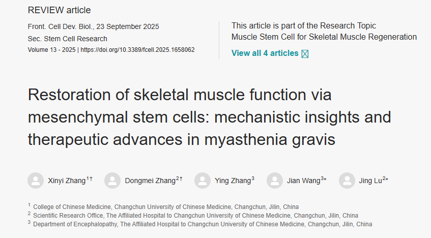 近期,國際權威期刊《Frontiers in Cell and Developmental Biology》刊載了一篇由中國長春中醫藥大學研究團隊撰寫的綜述。該綜述系統總結了間充質干細胞(MSCs)在改善骨骼肌功能以及干預重癥肌無力(MG)方面的作用機制與研究進展。