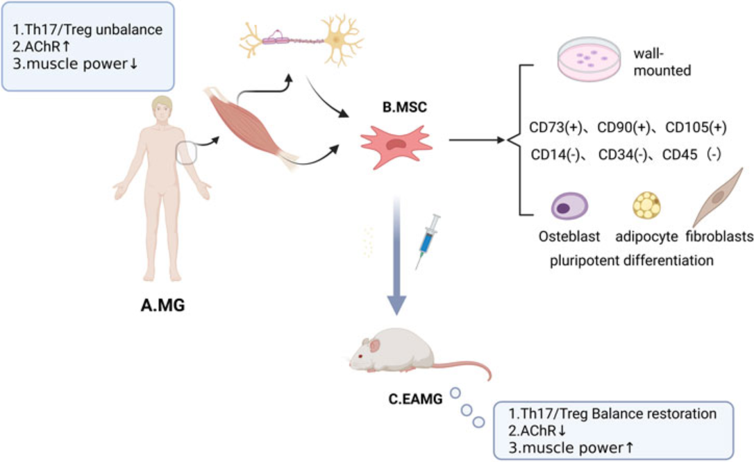 重癥肌無力(MG)是一種由自身免疫反應引發的神經肌肉疾病,其特征為肌肉無力,癥狀常隨時間或活動加重。發病機制主要與抗乙酰膽堿受體抗體攻擊神經肌肉接頭有關。MSCs 通過以下機制在MG中發揮作用: